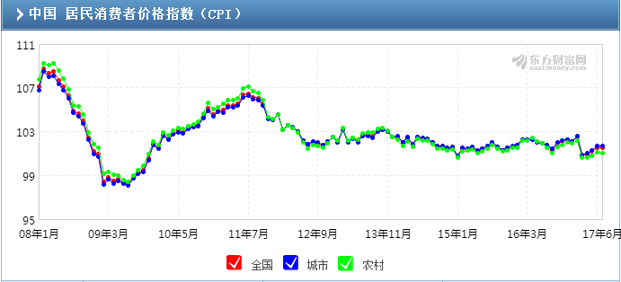 從下圖可以看到,國內(nèi)CPI指數(shù)自2011年開始下滑,近年來走勢穩(wěn)定,進(jìn)入2017年又有小幅下滑。這在一定程度上會限制消費類黃金的需求。