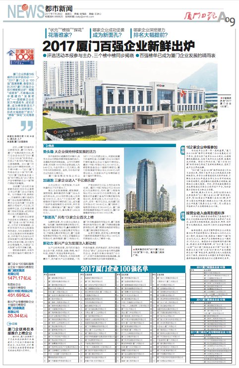 ?? ? ? 近日,由廈門企業(yè)和企業(yè)家聯(lián)合會(huì)、廈門日?qǐng)?bào)社、廈門廣電集團(tuán)聯(lián)合主辦,各行業(yè)協(xié)會(huì)協(xié)辦的“2017廈門企業(yè)100強(qiáng)”排序活動(dòng),歷經(jīng)2個(gè)多月的嚴(yán)格評(píng)選,已圓滿落幕。2017廈門百強(qiáng)企業(yè)排行榜掀開面紗,三個(gè)榜中榜——“2017廈門制造業(yè)企業(yè)十強(qiáng)”排行榜、“2017廈門服務(wù)業(yè)企業(yè)十強(qiáng)”排行榜以及“2017新興產(chǎn)業(yè)專精特新企業(yè)十強(qiáng)”排行榜也同步揭曉。