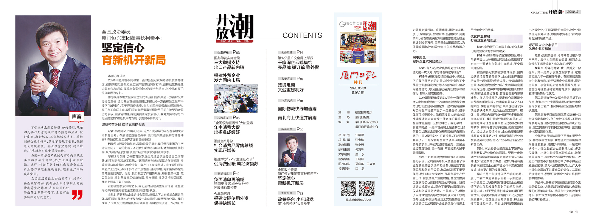 作為福建本地大型民營企業(yè)代表,廈門恒興集團(tuán)一方面積極踐行社會(huì)責(zé)任,全力開展支援抗疫捐款捐物,另一方面在復(fù)工復(fù)產(chǎn)中按下“快進(jìn)鍵”,實(shí)干擔(dān)當(dāng)作表率,全力挽回疫情帶來的經(jīng)濟(jì)損失。廈門市工商聯(lián)主席、廈門恒興集團(tuán)董事長柯希平日前在接受記者采訪時(shí)表示,后疫情時(shí)期,我們更要堅(jiān)定發(fā)展信心,要努力實(shí)現(xiàn)習(xí)總書記所提出的“在危機(jī)中育新機(jī)、于變局中開新局”。
